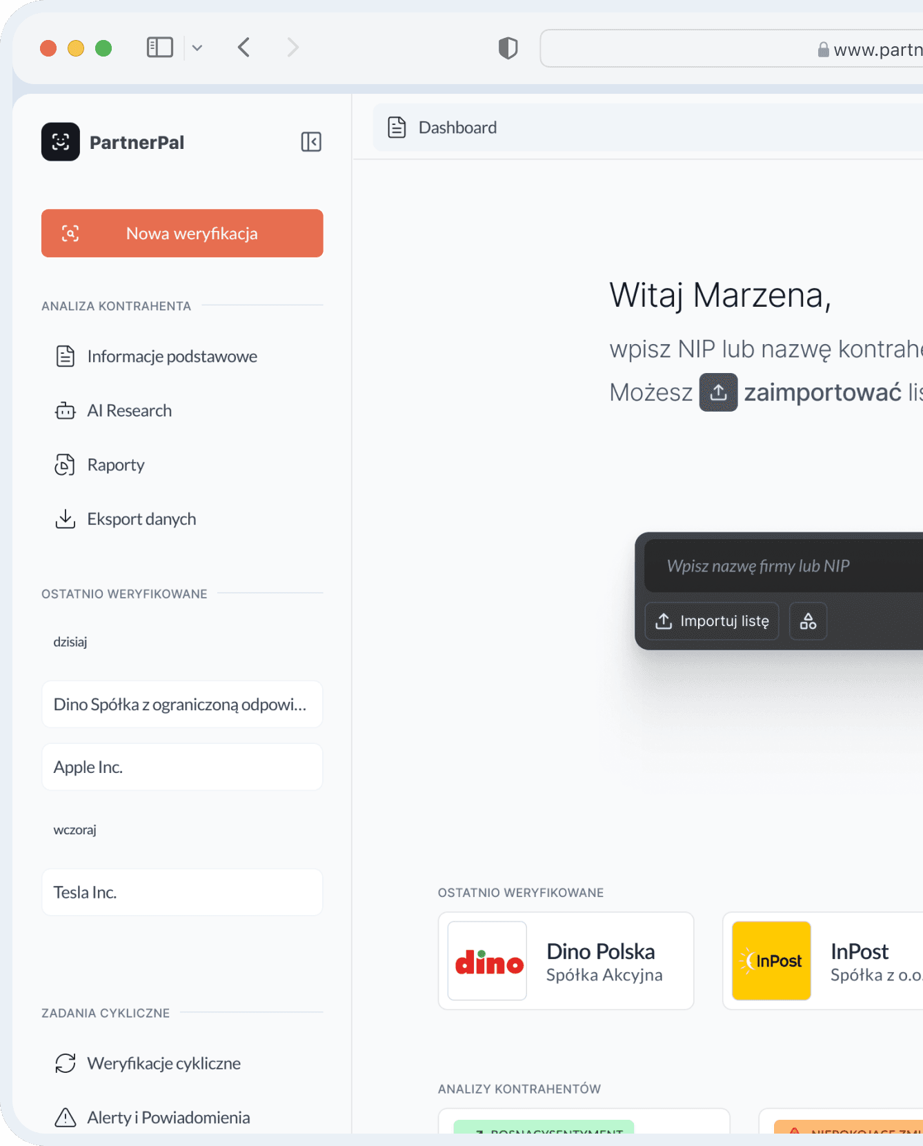Wyspecjalizowane agenty AI automatycznie zbiorą informacje z internetu i oficjalnych rejestrów, a następnie wygenerują kompleksowy raport dla Twojego zespołu współpracy z partnerami zewnętrznymi.
