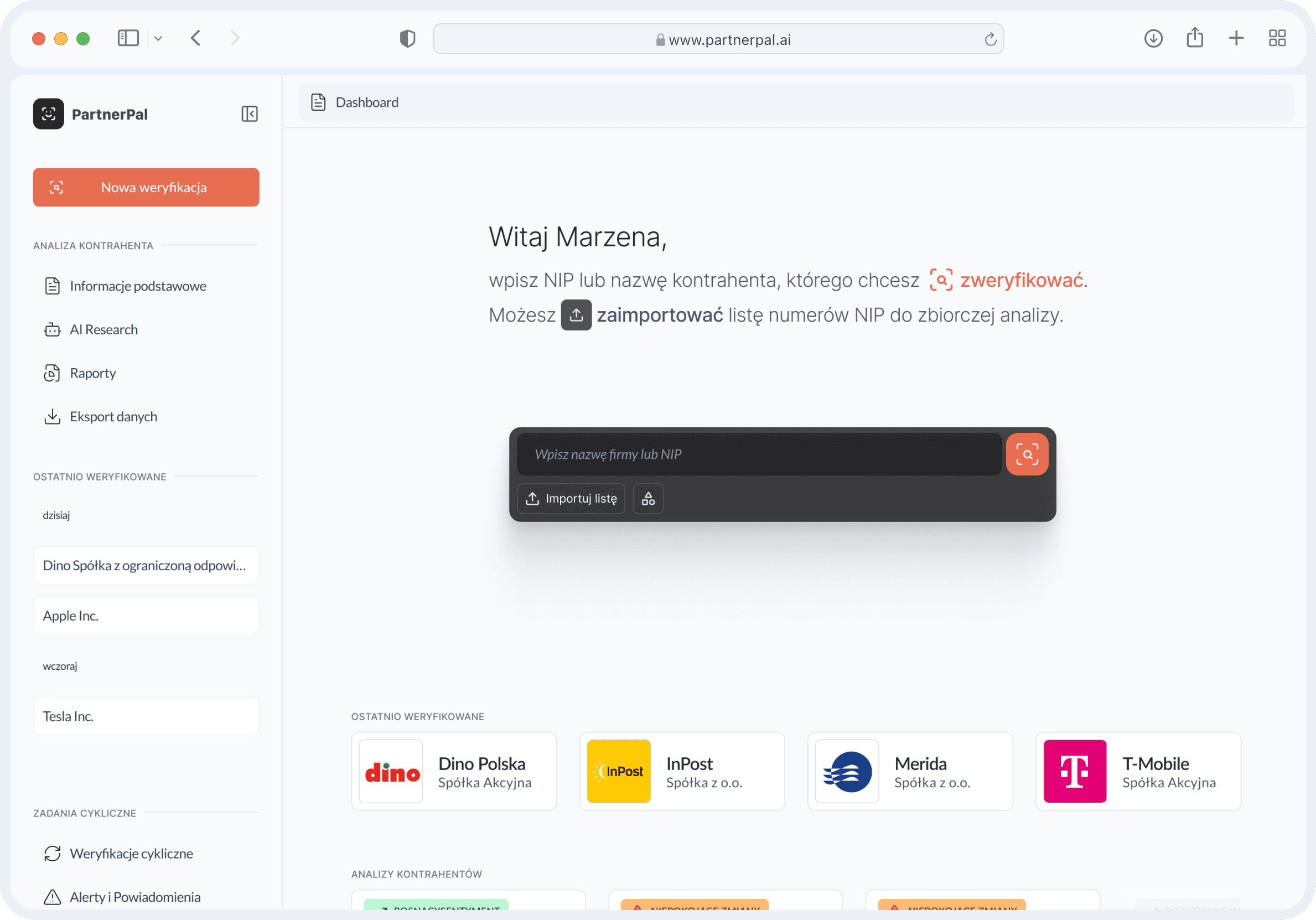 Wyspecjalizowane agenty AI automatycznie zbiorą informacje z internetu i oficjalnych rejestrów, a następnie wygenerują kompleksowy raport dla Twojego zespołu współpracy z partnerami zewnętrznymi.
